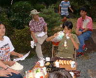 これは妹尾家の子どもたちの大好きなゲームです。大津さんの見本のあと、山田さんと藤近さんがトライしました。が、払はいきなりで頭がパニックになってしまい、その上、妹尾家の子どもの、質問の兵糧責めにあってしまい、しどろもどろ‥・。こどもはコワイ。