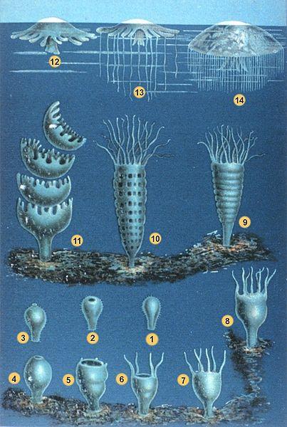 「クラゲは、そのサイズが一般にポリプよりも大型であるために成体とみなされているが、生活史の中では有性生殖のために短い期間に出現する『泳ぐ生殖巣』と捉えることができる。その理由は、クラゲが外洋性の種を除き、繁殖時期にポリプから発生するためである。柿沼〔〕は、このようなクラゲの生活史上の特性を季節が来ると咲く花にたとえている。」(科学2009年4月号/「クラゲ形の起源と進化」より)※柿沼好子/in岩波講座現代生物科学10