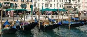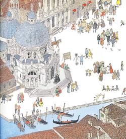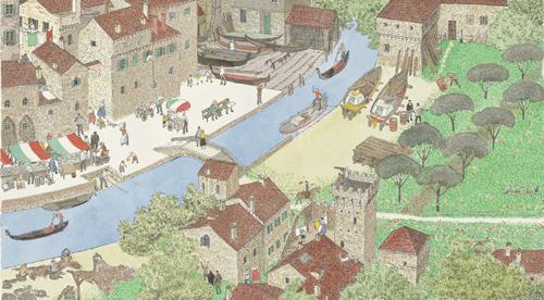 by forest-doorさん ベネチアといったら運河、ゴンドラです。大運河(カナル・グランデ)を行くゴンドラが描かれています。 昔、お金持ちは自家用ゴンドラを豪勢にして競い合ったため、政府はゴンドラを黒一色にすること、と法令を出しました。また、大きさも統一されています。船首についているくしの形のような飾りはフェッロ(鉄)と呼ばれていて、見通しのきかない水路での先触れになっているそうです。そして、ゴンドラをこぐのは、ゴンドリエーレというこぎ手で、縞模様のシャツ、カンカン帽がお決まりの服装です。 そして、縞模様のポールが運河につきたてられていますが、これは船着場を意味するそうです。 |