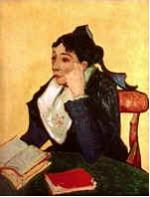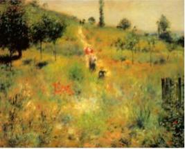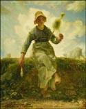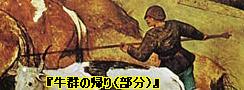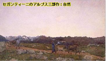 前にも出てきた、ジョヴァンニ・セガンティーニ(Giovanni Segantini)の遺作となったアルプス三部作の中の『自然(La Natura)』からだろうと思います。視点や構図は違うのですが、たぶん間違いないと思います。セガンティーニの絵では左の端で反対方向に牛を追っている男の人がやはり頭を下げて歩いています。そして、安野さんの絵では並んで歩いている女性は、この絵では二頭の牛を引いて歩いています。このように、視点を変えて描き直すのは安野さんお得意のことですね。