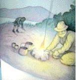 2)子どもが薪を集めおじいさんが火をおこしています。これは、ユリー・シュルヴィッツの絵本『よあけ』からです。翻訳も良いですね。たとえば・・・