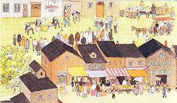 巨大な農場の様子です。絵には遠景に、ミシシッピー川を行く蒸気船も描かれています。安野さんはその部分ははぶかれています。安野さんの絵は遠くを小さく描く遠近法を採用されていませんから、絵の遠景が広がるように書き換えられているのがよくわかります。平面から見て上から見たように描くなど、安野さんの頭の中はすごい置き換え装置があるようです。