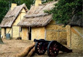 6)丸太小屋があって、外では男の人が柵のための杭を打ち込んでいます。|