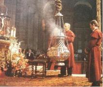 重さ80kgという巨大なものです。普段は大聖堂の図書館に保管されているます。重要なイベントの際に、聖堂の天井に吊り上げられ、専門家が振り子のように振り、宙を舞うのです。パイプオルガンの大音響がと共にその芳香が、聖堂全体を包むのです。そもそもは、800kmにも及ぶ巡礼を終えて、汗まみれになった巡礼者の悪臭を清める目的で、行われるようになったのだそうです。