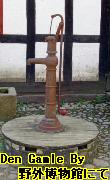 12)手押しポンプを一生懸命押して、洗濯をしている女性を、ビンを持った男の子が見ています。