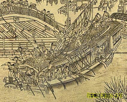『清明上河図』の船も竿をさしている状況から判断して時計回りにまわしています。ところが、そのことは、Uターンさせるというよりは橋に対してまっすぐ向けさせようとしていることになります。橋の上からロープが船首の人に向かって投げられています。ロープでは引っ張ることしかできませんから、やはり船首を橋側に寄せようとしています。したがって、Uターンというよりは横向きになってしまった体勢を立て直してまっすぐしようとしているように見えます。そもそも帆柱を倒しているということは、虹橋の下をくぐりぬけようとしているのではないかと思います。水面から橋までの高さを考慮に入れると、橋の中央をくぐるとぶつからずにすむと考えられます。『清明上河図』全体を見ても、橋の右にも左にも大型の船が見えるので、帆柱をたためば橋の下をくぐれるように、虹橋は作ってあるのだろうと思います。