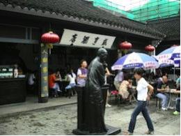 写真の店では、小説の中に出てくる孔乙己(コンイーチィ)の像が店の前に造ってあります。お金が充分に無いので、外で立って飲んでいます。とはいえ回りの短い着物しか着られない労働者と異なり、長い着物を着ています。(最も汚い着物ですが・・・)こだわりを捨てて酒を飲む孔乙己は、魯迅の身代わりとの説もあるようです。日本人にとっても関わり深い作家だけに、日本人の観光客もたくさんいっているようです。安野さんもこの店に行ったと解説に書いておられます。