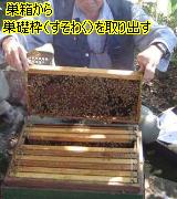 巣礎枠(すそわく)を取り出しています。養蜂箱の中にはハチたちが蜜を貯めやすいように巣礎枠を何枚も入れておきます。ハチがふえてくると、自分たちで巣を拡張してゆき、蜂蜜を貯めてゆきます。これを、取り出して遠心分離で蜜を取り出します。ハチに刺されることに耐性がある人は、網をかぶらずに作業をすることがあります。ちなみに、巣箱から取り出すのは本来とても危険です。社会性のハチであるミツバチは巣を護るためなら自分たちの命さえ捨てて攻撃してきますから。・・・どうして、刺されないのか。実は、煙をかけるとハチはおとなしくなるのです。