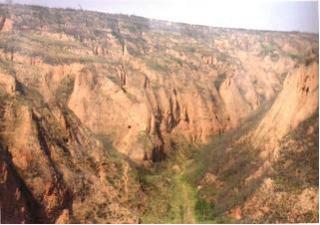 ・・・黄土は微細で非常に固いのですが、水に簡単に浸食されやすく、一旦崩れると粉状になって飛び散りやすい土壌です。またこの一帯は年間降水量が少なく乾燥地帯とはいうものの、その少ない雨量の65%が夏季に集中していて、大豪雨になります。この豪雨もこの一帯の土壌流失の原因ということになります。