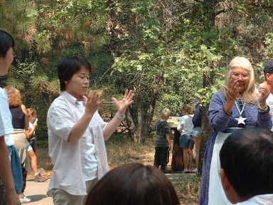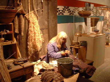 ところで、彼女はしきりに「インディアン」と言う言葉を使いました。インディアンは英語では本来インド人という意味ですから、これはアメリカ先住民に対する呼称としては、コロンブスの誤解に起因する不適切な表現です。同行者の一人が確認しました。「インディアン」と呼ばれるのを好むのか「ネイティブアメリカン(アメリカ先住民)」と呼ばれるのを好むのかと。彼女の答えは明確でした「ネイティブアメリカン」と呼ばれたいと。その上で、どう呼ばれても良いというのです。なぜなら彼女自身が自分はどこから来てどういう存在か分かっているのだから他の人がどう呼ぼうが私は平気だと言うのです。どう呼ばれるかは民族の心としては大切なことです。いい加減な呼ばれ方をすることは好ましく無いに決まっています、でもそれ以上に大切な事は彼女自身がどのように自らを受け入れているかです。まさにその意味で彼女は彼女自身のルーツを完全に受け入れて安定しているのです。また、彼女はこのようにも言いました。「ネイティブアメリカン」と言ったときそれは彼女のような先住民だけでなくアメリカで生まれた人々をも意味するのだからと。彼女のこのような言い方の中に、むしろ先住民であることの誇りと思想性・精神性があると思いました。 これは彼女自身が3/4先住民で1/4白人(彼女自身は先にもあげたように白人というくくり方をせずクロニアンという表現をしました。・・・白人というくくり方に没文化性を感じられているのでは無いかと思います)であることにもよるかも知れません。いずれにしても、彼女はそのようなルーツをふまえてより高い精神性を手に入れていたのです。私はこのことにアメリカという社会がたどり着いた高い精神性を見たような気がしました。無論アメリカ人総てが彼女のような高い精神性を手に入れている訳では無いでしょうが・・・。私は彼女が語ってくれた内容と、彼女の存在そのものに強く勇気づけられました。 お話の後、ミュージアムの庭に復元された遺跡の説明を直接受け歌を歌いダンスを共にしながら、なんて幸せな存在なんだろうと思っていました。彼女か生きた72年の間にアメリカ社会が果たした変化、それを前向きに受け入れた彼女、そしてその人に接する事のできる私たち、総てがなんと幸せなんだろうと。 こうして1時間の予定が2時間となり彼女の昼休憩を奪ってしまうことになったのですが・・・。 彼女と別れて昼食を食べた後、もう一度ミュージアムの中を見に行くと、展示室の一角でカゴ作りの実演を黙々と行っている彼女の姿がありました。静かに輝いていました。 |