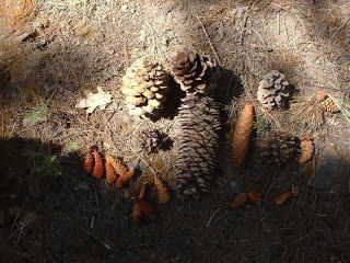 ートしましたが約2時間の待ち時間を退屈す ることはありませんでした。それぞれが森の 中にはいて楽しみます。クマのフンが見つか ります。どうも前年の秋に落とされたもので、 マンザニータの種がいっぱいのフンです。完 全に乾いていてにおいをかいでみると香ばし い香りがします。あるいは大小の松ぼっくり やキノコなどが見つかってきます。シャリー の話すお話を聞いているのもエキサイティン グで瞬く間に時間は経過していました。自分 の番になってゆっくりと歩き始めます。とて もゆっくり歩いたはずなのに20分くらい歩 |