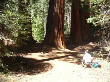 小屋を中心に時間を気にすることも無くいくつ かのアクティビティーを体験します。何とも贅 沢な時です。夕暮れが近づくと夕食作りの担当 者以外の人たちは森を散策です。シャーリーが ジャイアントセコイアの下で歌い出します。カ ーペンターズのナンバーを中心に澄み切った美 しい歌声です。何となく人が集まってきて楽し そうに聞いたり一緒に口ずさんでいます。 夜は各自森の中の好きな所で寝ることができま す。セブンシスターズの所に戻って木 の間に寝ようと言う人、小屋の近くで寝ようと 言う人、もっと森の入って一人でジャイアント セコイアに寄り添おうという人と、それぞれで す。私も一人で向かい合える | ![]() |