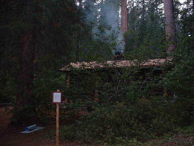 古い倒木の破砕した幹の中にしみ出している樹 液を見つけてなめてみたり、倒れた折れ株(切 ってないのだから)の年輪の不思議な並び、木 の幹でなく枝に留まってさえずっているキツツ キ等々どんどん飛び込んでくるのです。私の大 好きなサイレントウォークのような気分です。 そして、セブンシスターズとの出会いです。そ れは、マーセドグローブが始まる入り口のとこ ろに固まってはえている7本のジャイアントセ コイアのことです。ほとんど同じくらいの大き さで、7本の内5本は密生して直線上に並んで います。直線上に並んだ5本は倒木更新(倒れ た木の上に着床した種が発芽してあたかも人間 が植えたかのように直線的に木が生える)によ るものだろうと思います。日本の原生林では普 通に見られる倒木更新ですが夏季の乾燥が激し い自然条件の為に倒木の上にもコケなどがつか 無いためか、他では倒木更新と考えられるよう な例は見ることができなかったのです。ところ が局地的に湿気が多い場所だったので倒木にコ ケがつき着床が起こったものと思われます。 ともあれ、巨大なジャイアントセコイアが寄り 添うように静かに立っている姿は、不思議なも のでした。そこまでの静かなゆったりとした歩 きによって、心を静かにさせ、森のありようを そのままに受け入れる心根になっていましたか ら、セブンシスターズと向かい合うだけでイン ストラクターのシャーリーが毎回彼女たちに許 しを得てグローブに入ってゆくように、私もそ れぞれに一本一本のジャイアントセコイアにさ わり見上げ語りかけながら許しをもらって森の 中に入って行く気持ちになりました。セブンシ スターズを過ぎて、何本かのジャイアントセコ イアを過ぎて行くとこのソロウォークのゴール であるロッジに着きます。このロッジはヨセミ テインスティチュート(YI)が管理しYIの プログラムの参加者だけに使用が認められてい る丸太小屋です。それは大草原の小さな家のロ ーラが出てきそうな小さな小さなログハウ スです。かっては見張り小屋として作られた歴 史的な建造物を、忠実に復元したものだそうで、 余計なものは何もありません。小さな板の間が 2つ、そして小さな台所が一つ、それだけです。 台所にはカナダ製のマキかまどが一つ、反対側 に流し台が一つ。流し台にはフィルターが一つ 取り付けられています。水は近くの小さな沢で 汲みすべてフィルターで濾過して使います。そ のままの水を飲むことも手を洗うことも禁じら れました。したがって顔を洗うのも歯を磨くの もコップ一杯くらいの水ですませてしまいます。 トイレは大の方だけ外の溜め込み式のトイレで すまします。そして食器洗いに使った洗剤入り の汚水もトイレに捨てます。タンクが一杯にな ったら回収にやってくるようです。こうして小 屋が存在することでグローブに与える影響は最 小限に押さえる努力がされているのです |
