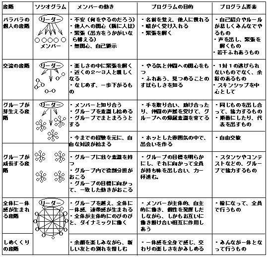 遊び心を起こして(日常生活を忘れる)、やる気を誘うもの リーダーがひっぱって、メンバー間の交流を理屈抜きで心を開かせ、全員の和作りを進めるもの |