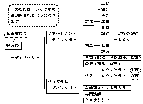 運営組織を作るうえにおいて大切なことは、スタッフの持ち味が生かされるようにすることです。また、参加者にも役割分担をするなど、「みんなで作ったキャンプ」にすることが大切です。