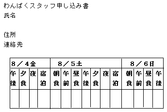 留意事項 スタッフになってくれる人を確認するときは、入所時間と退所時間をはっきりさせてもらいます。できれば、書面にしてもらうと間違いがありません。 |