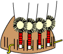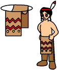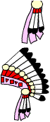 | 5.芯の接着してない部分に糸を通し、糸の長さを調節して、羽根を立たせ、全体よい形になるようにして結ぶ。 | 6.幅広の布テープ(ヘッドバンド)を羽根の根元が隠れるように縫い付けるか、ボンドで接着する。 | 7.耳の当たりにたれ飾りをつける | 【インデアンの模様】 |