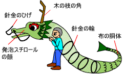 【ドラゴン】 頭部は発泡スチロールでつくり、胴体は自由に動くように、針金を輪にして、布で作ります。 |