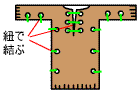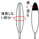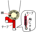 4.細引きの紐を羽の芯の輪に通し、帽子にとめていく。 中央から始め順次左右に。 |