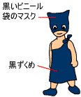 | ・布を形に切る | ・わきと袖の下を留める | ・市販のズボンを利用 | ・横にヒラヒラをつける | |