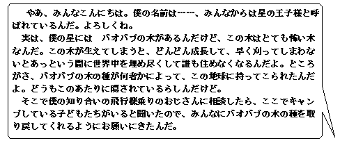 例;課題ハイク (ストーリー) わんぱくたちは、森の仙人善養院様に会うためにさまざまな修行をしながら善養院のもとへ向かいます。 (活動のねらいと概略) 地図を元に設定されたコースを進み、途中で出てくる森聖霊たちが出す課題をクリアーしながら進んで行きます。 ・ 仲間の協力と自然とのふれあい |