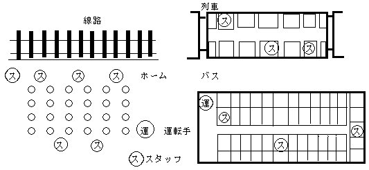 B 乗車方法の説明……座席と、車中でのこと、荷物の置き方等について説明します。