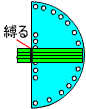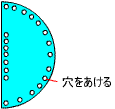 | @ ビニールシートを半円形に切ります。(絵をかいてもよい) | A 竹の一方を縛り、ビニールシートの上に置きます。 | B ビニールシートの両端を重ね、ロープで止めます。 |