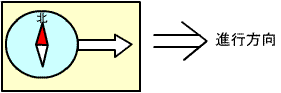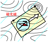 | コンパスをしっかり構えたままかただをゆっくり回して、赤い針を北と合わせます。 | このときの進行線の方向が目的地に進む方向です。 |