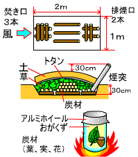 草花や果物等を空き缶の中に入れ、周りにおが屑を詰めて口をアルミホイルで蓋をし、遠火で過熱します。