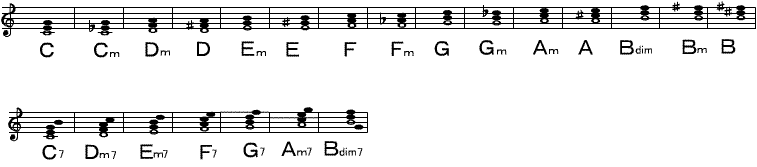 | C | D | Em | F | G(7) | Am | Bdim | |